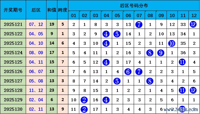 后分别析:上期后区开出02 11,跨度9,近十期跨度是:5、1、6、1、7、1、3、1、2、9,波动边界较大,跨度边界在1-9之间,本期预测跨度值不变,重心热心号码01 10,跨度9。